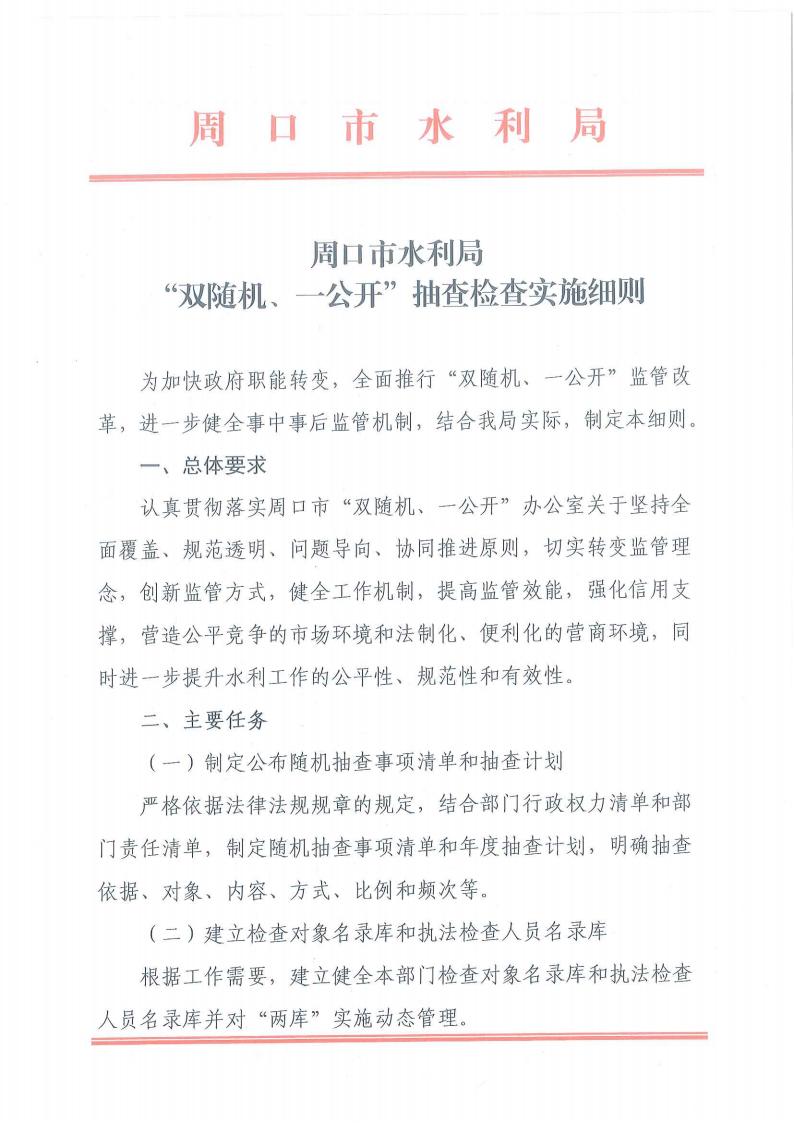 周口市水利局“双随机、一公开”抽查检查实施细则