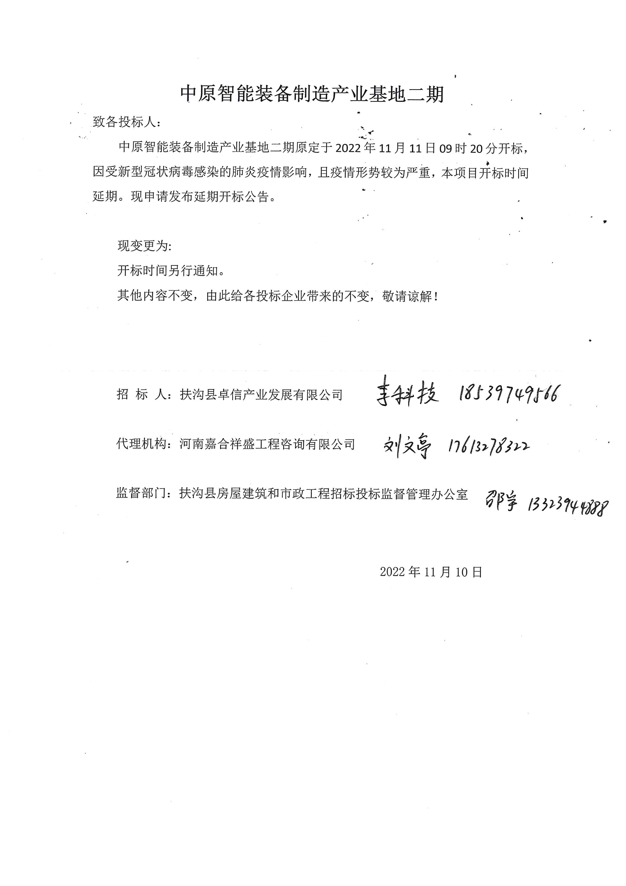 中原智能装备制造产业基地二期原定于2022年11月11日09时20分开标,因受新型冠状病毒感染的肺炎疫情影响,且疫情形势较为严重,本项目开标时间延期。现申请发布延期开标公告。