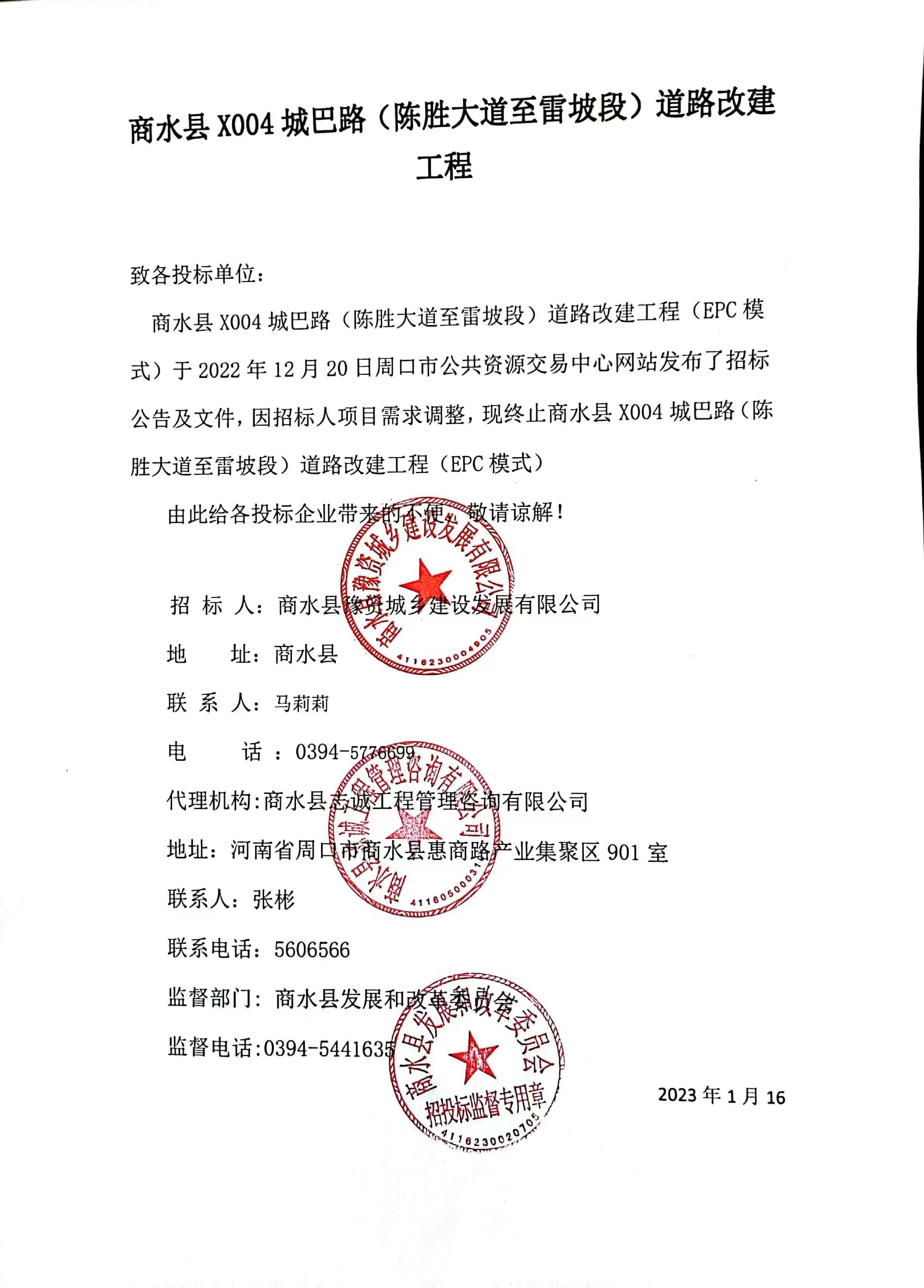 商水县X004城巴路(陈胜大道至雷坡段)道路改建工程(EPC模式)于2022年12月20日周口市公共资源交易中心网站发布了招标公告及文件,因招标人项目需求调整,现终止商水县X004城巴路(陈胜大道至雷坡段)道路改建工程(EPC模式)