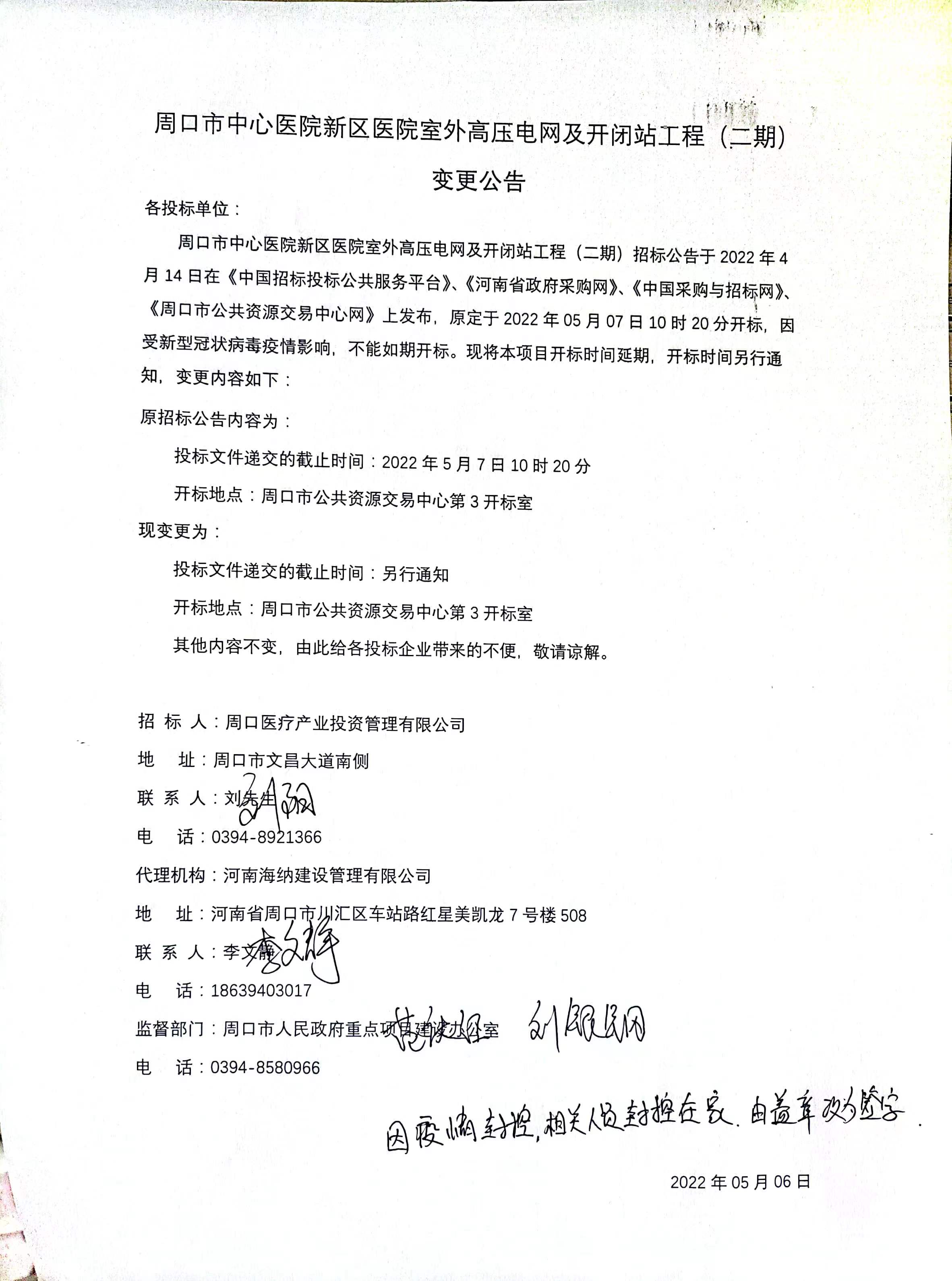 周口市中心医院新区医院室外高压电网及开闭站工程(二期)招标公告于2022年4月14日在《中国招标投标公共服务平台》、《河南省政府采购网》、《中国采购与招标网》、《周口市公共资源交易中心网》上发布,原定于2022年05月07日10时20分开标,因受新型冠状病毒疫情影响,不能如期开标。现将本项目开标时间延期,开标时间另行通知,变更内容如下: