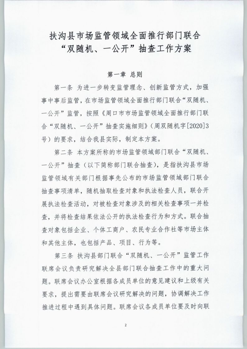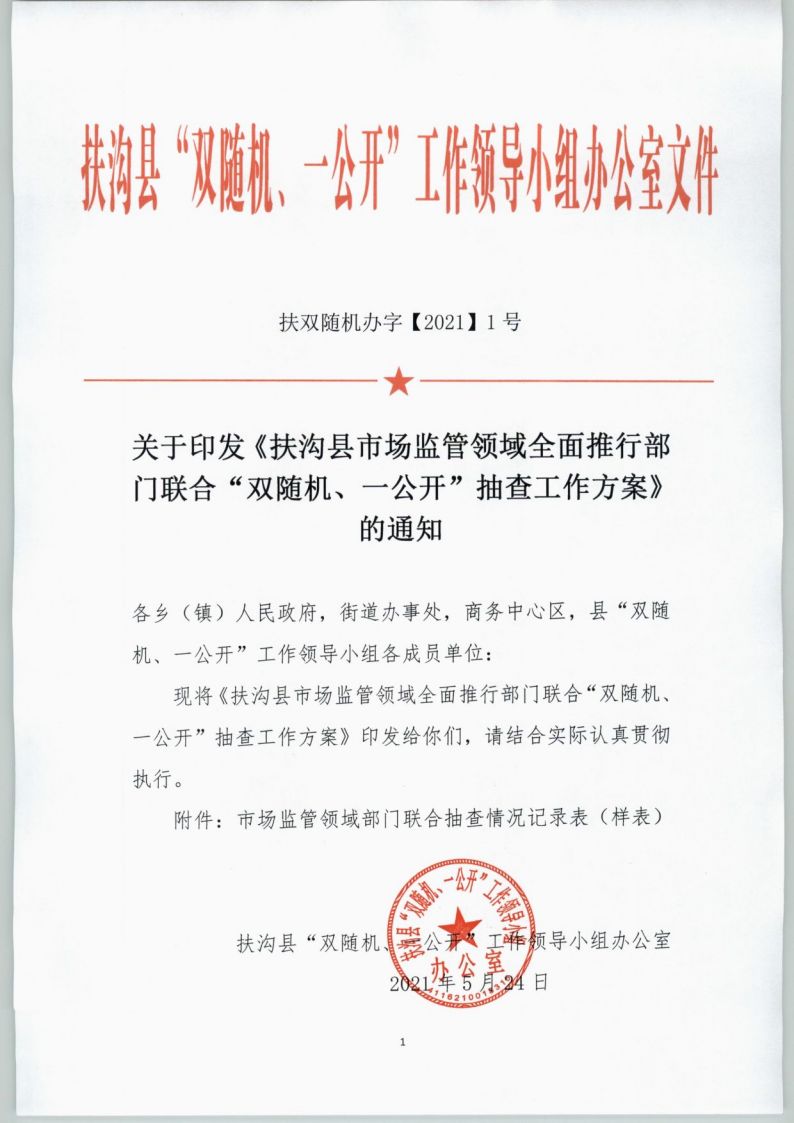 1、扶沟县“双随机、一公开”工作领导小组办公室关于印发《扶沟县市场监管领域全面推行部门联合“双随机、一公开”抽查工作方案》的通知.pdf