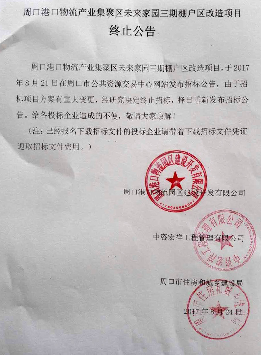 周口港口物流产业集聚区未来家园三期棚户区改造项目,于2017年8月21日在周口市公共资源交易中心网站发布招标公告,由于招标项目方案有重大变更,经研究决定终止招标,择日重新发布招标公告。给各投标企业造成的不便,敬请大家谅解!