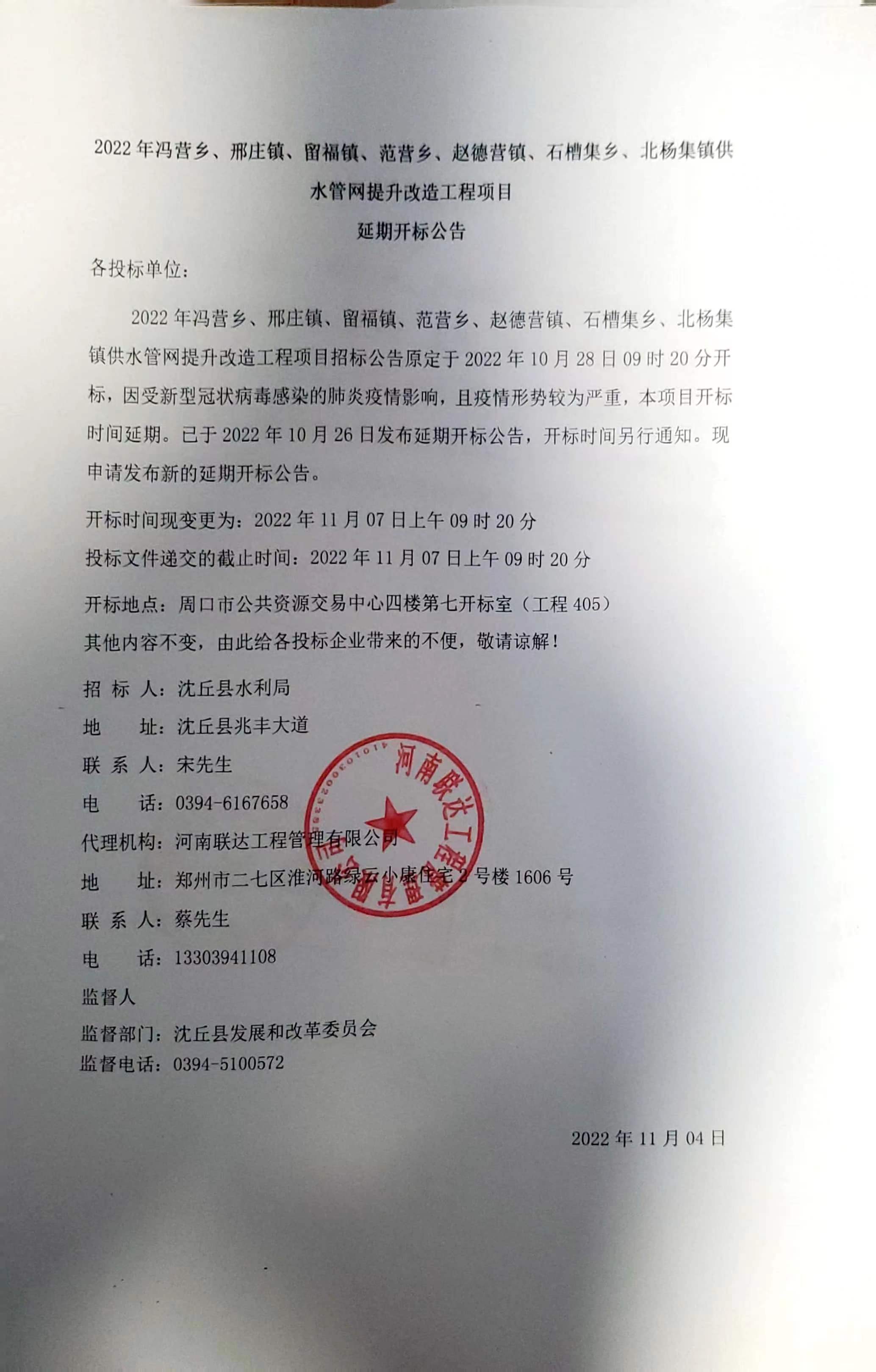 2022年冯营乡、邢庄镇、留福镇、范营乡、赵德营镇、石槽集乡、北杨集镇供水管网提升改造工程项目招标公告原定于2022年10月28日09时20分开标,因受新型冠状病毒感染的肺炎疫情影响,且疫情形势较为严重,本项目开标时间延期。已于2022年10月26日发布延期开标公告,开标时间另行通知。现申请发布新的延期开标公告。