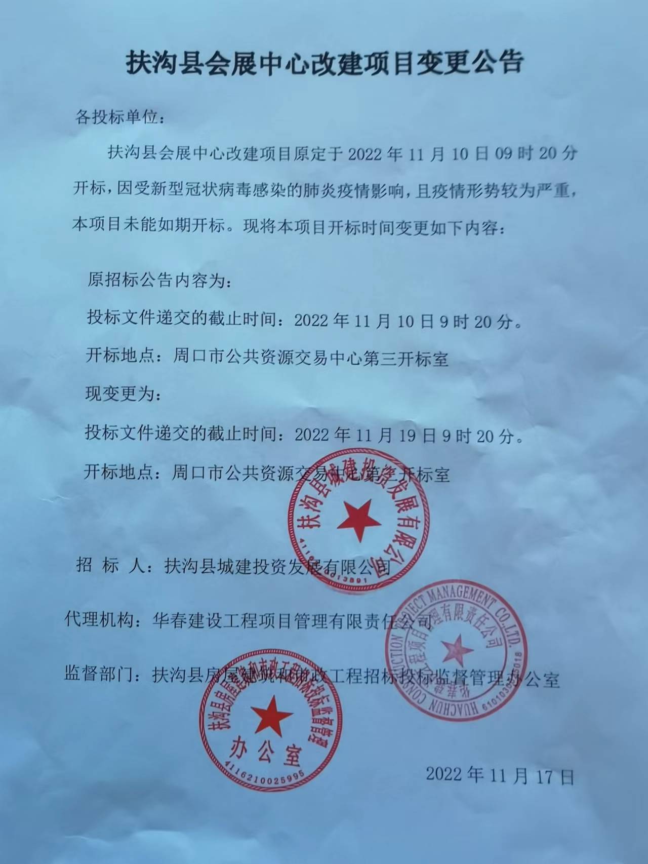 扶沟县会展中心改建项目原定于2022年11月10日09时20分开标,因受新型冠状病毒感染的肺炎疫情影响,且疫情形势较为严重,本项目未能如期开标。现将本项目开标时间变更如下内容: