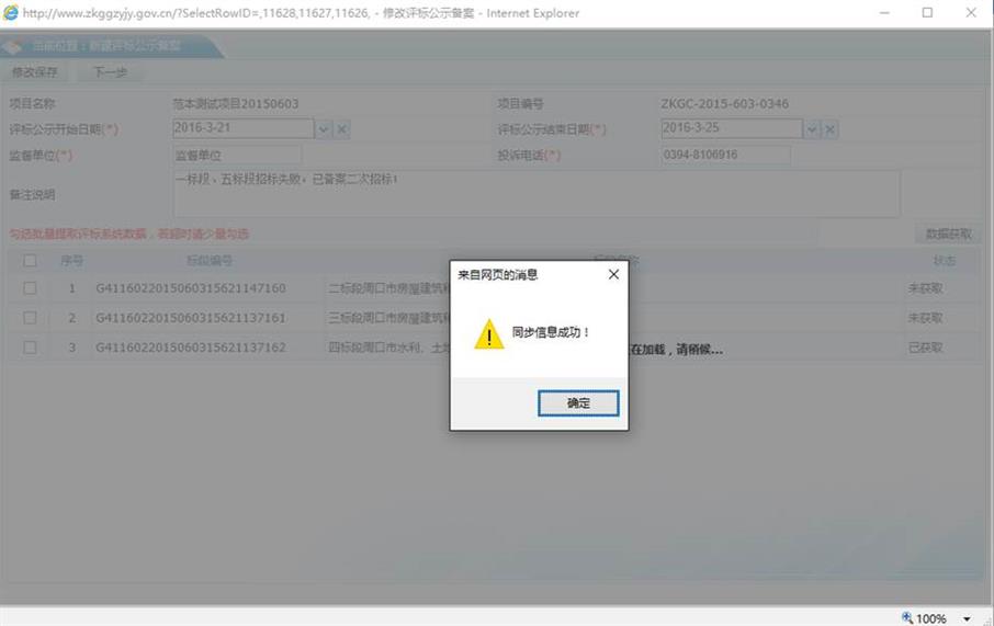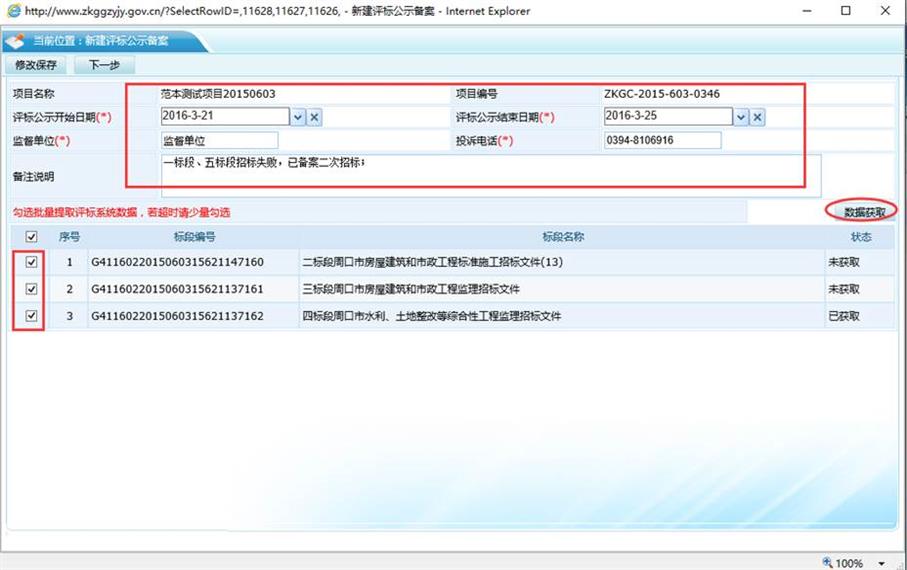 2、填写公示详细信息,对于未获取的电子标的评标结果请勾选后点击数据获取按钮;