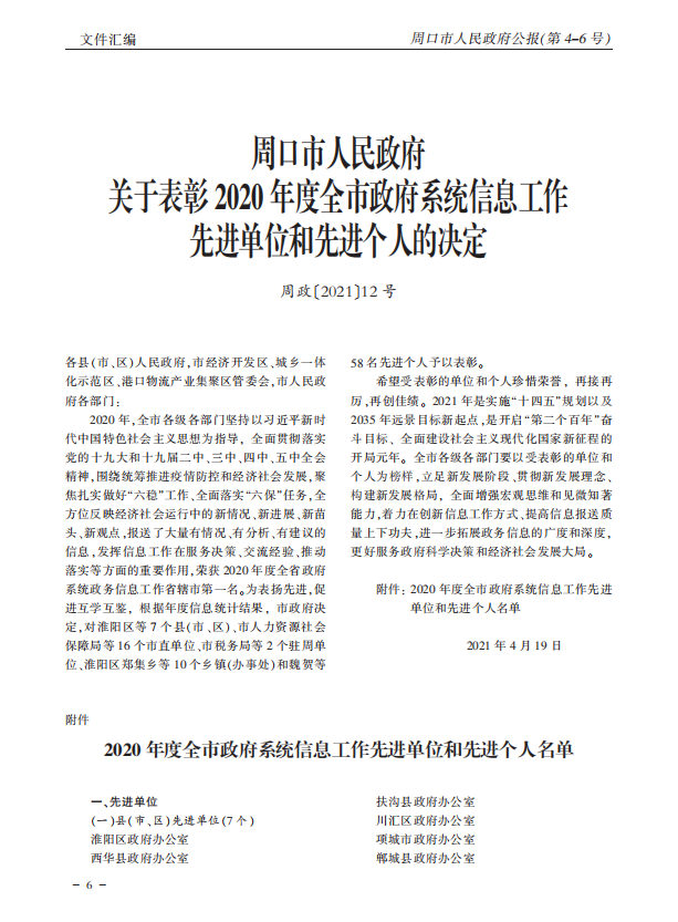 周口市人民政府关于表彰 2020 年度全市政府系统信息工作先进单位和先进个人的决定