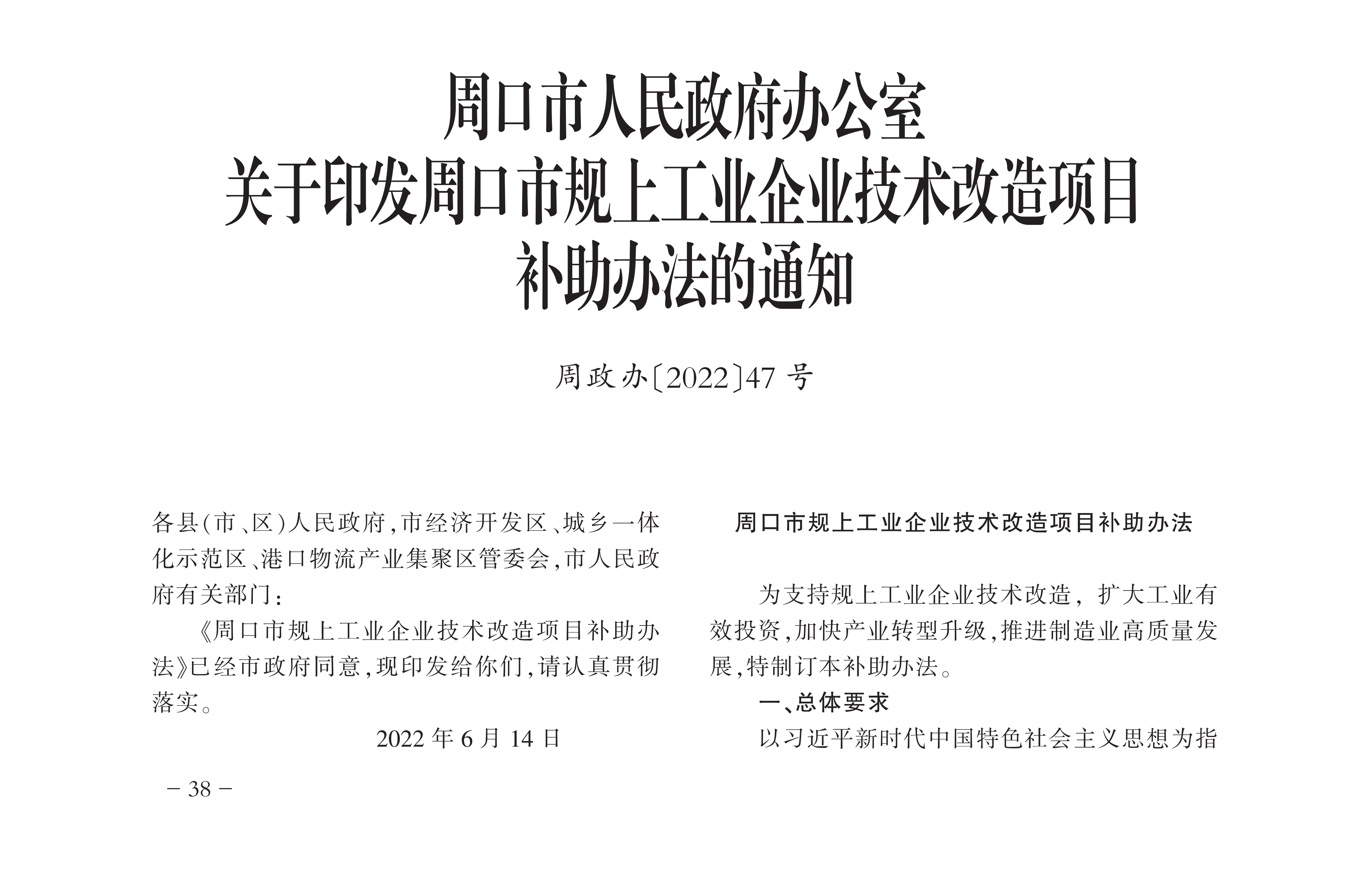 周口市人民政府办公室关于印发周口市规上工业企业技术改造项目补助办法的通知