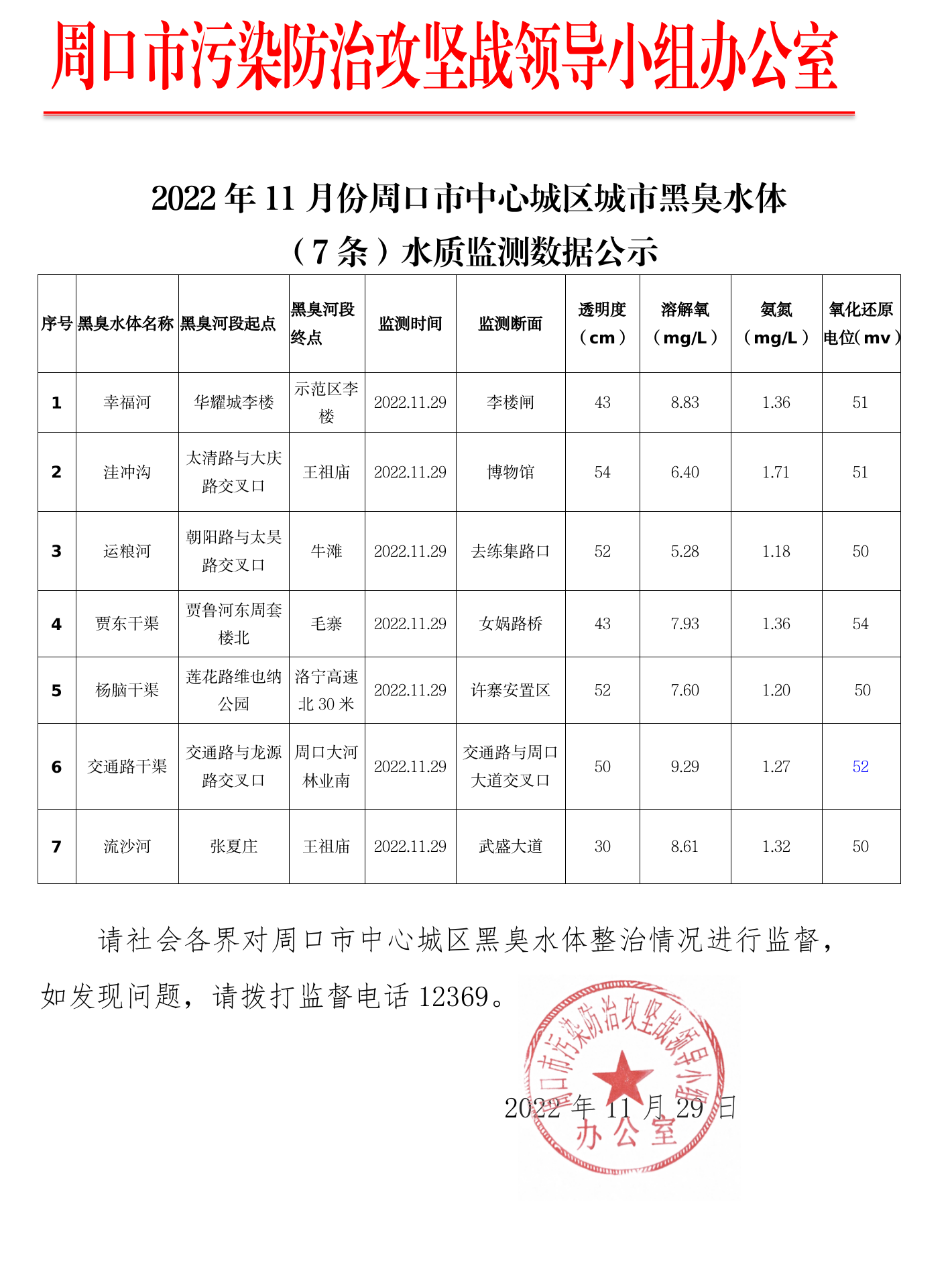 2022年11月份周口市中心城区城市黑臭水体(7条)水质监测数据公示