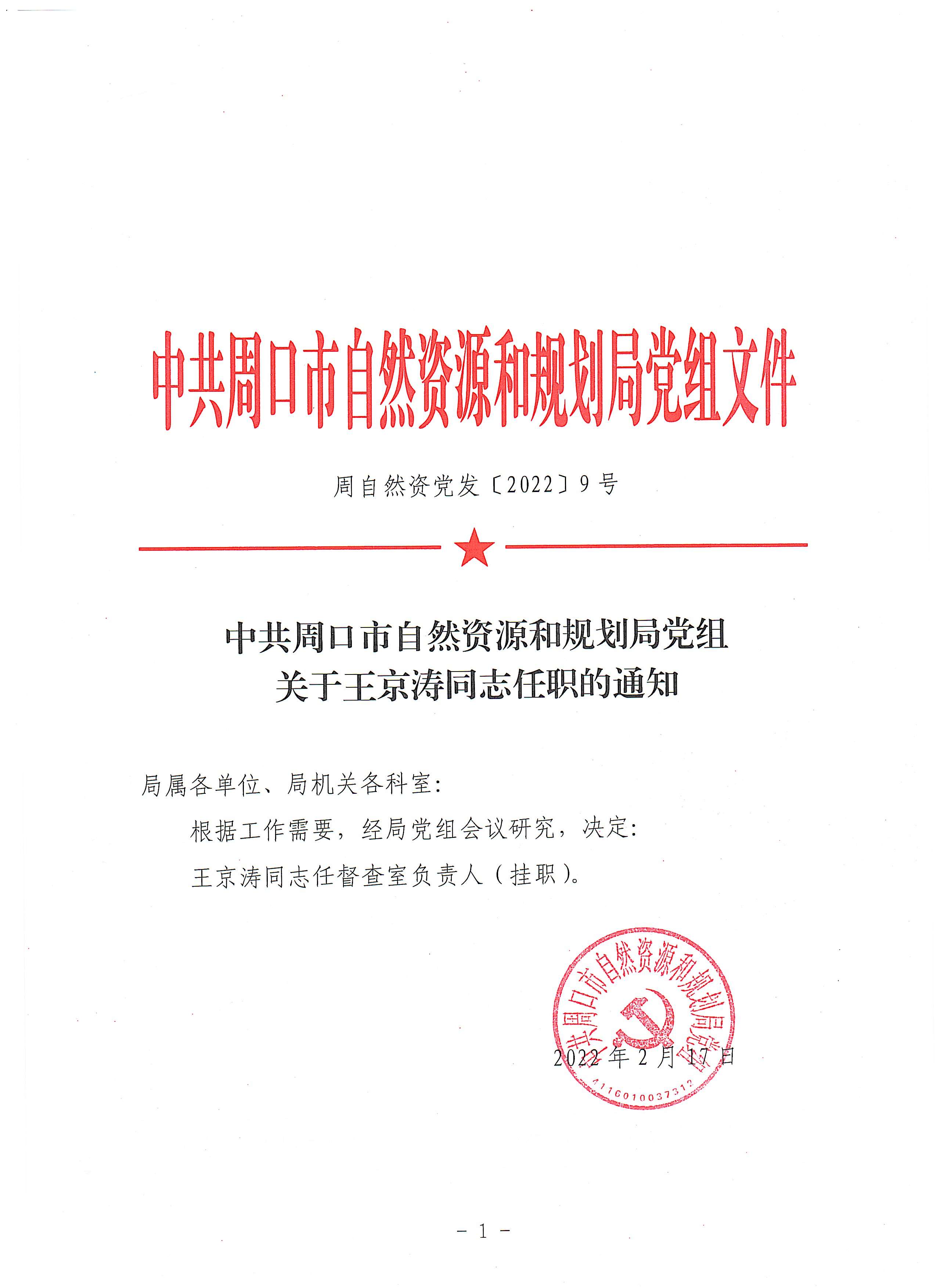 关于王京涛同志任职的通知