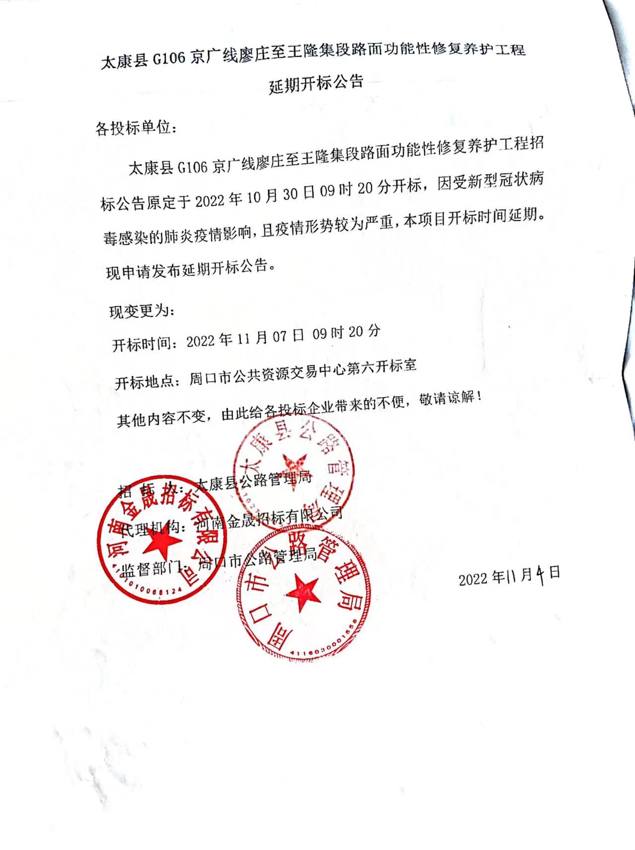 太康县G106京广线廖庄至王隆集段路面功能性修复养护工程招标公告原定于2022年10月30日09时20分开标,因受新型冠状病毒感染的肺炎疫情影响,且疫情形势较为严重,本项目开标时间延期。现申请发布延期开标公告。