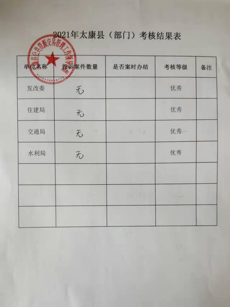 2021年太康县(部门)考核结果表