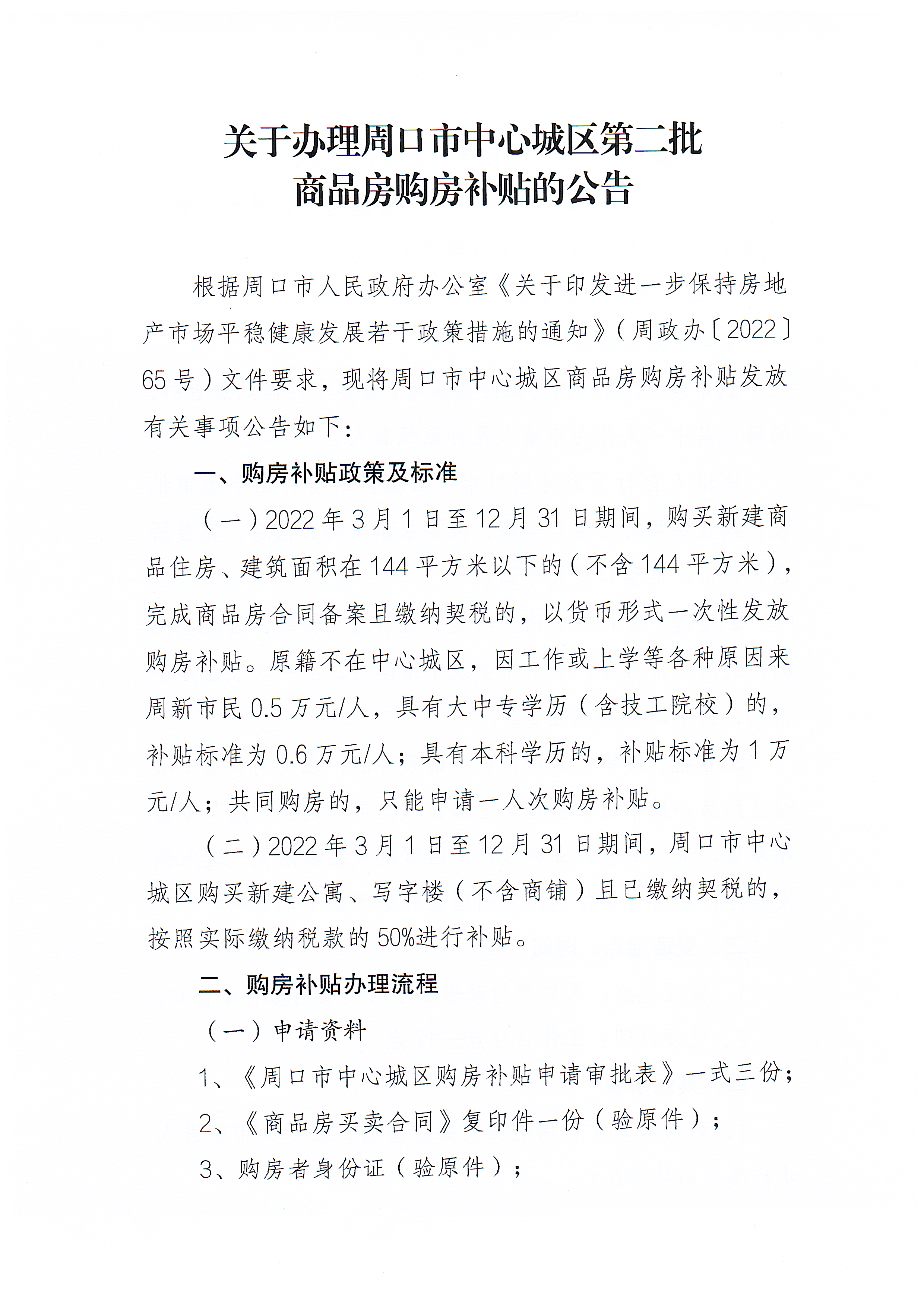 关于办理周口市中心城区第二批商品房购房补贴的公告